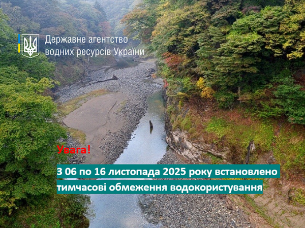 У зв'язку з маловоддям на окремих річках України Державне агентство водних ресурсів, відповідно до наказу Держводагентства від 06.11.2025 № 176, з 06 листопада 2025 року встановлює тимчасові обмеження для водокористувачів, які здійснюють спеціальне водокористування з поверхневих водних об'єктів.