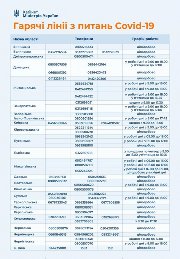 Інформуємо, що з питань стосовно карантину, допомоги людям під час карантину, алгоритму виявлення та лікування коронавірусної інфекції COVID-19 звертайтеся на телефони гарячих ліній